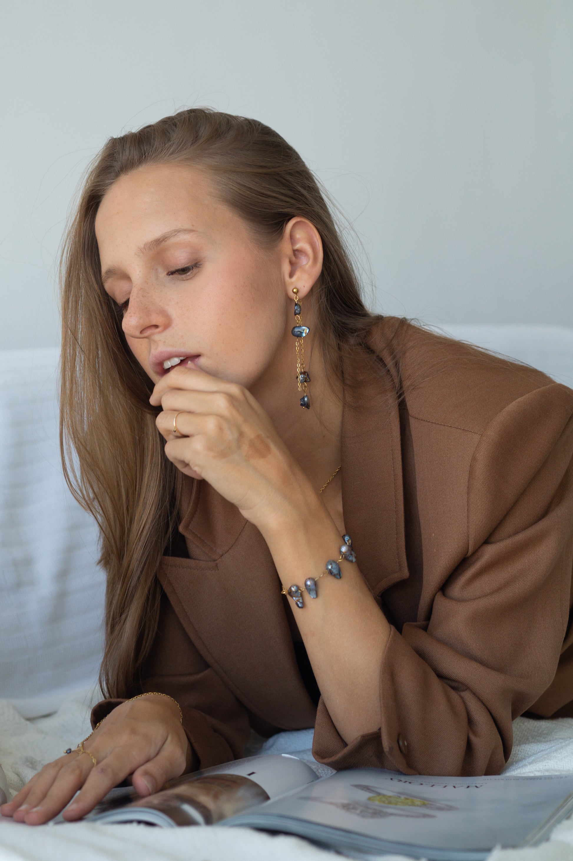 Composición: perlas azul/gris oscuro, acero inoxidable.